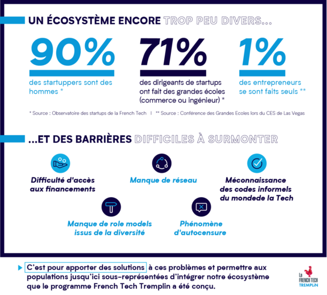 L’initiative French Tech Tremplin vise à faire en sorte que l’écosystème French Tech soit aussi riche et pluriel que la société dont il est issu. L’objectif : optimiser les chances de populations jusqu’ici sous-représentées dans ce milieu en mobilisant des financements, des formations et un système de mentorat. Ce programme a été conçu pour rééquilibrer les chances et faire en sorte que tous aient accès aux mêmes avantages que les entrepreneurs issus de milieux privilégiés.