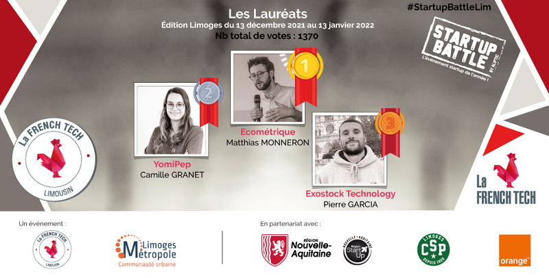 Vous avez été nombreux à voter pour leurs projets lors de la phase de vote des teasing vidéo puis lors de la deuxième phase de vote dédiée à leurs pitchs : après cumul des votes du public et des jurys nous vous annonçons les 3 startups lauréates de l'édition Limoges 2021...